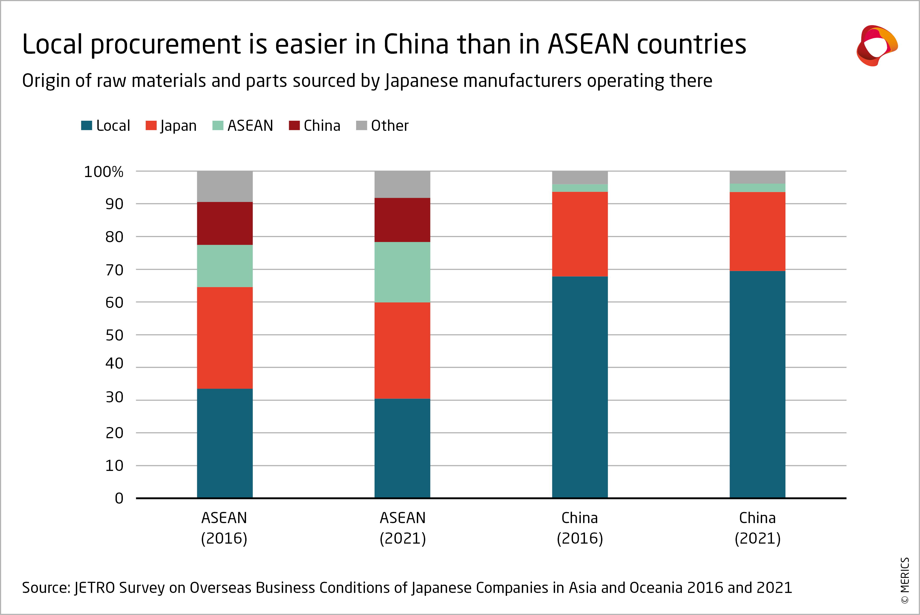 As China’s Covid-19 lockdowns took hold in early 2020, these companies found their ASEAN manufacturing sites exposed to events in China. They learned that moving final production assembly from China would not cut dependence if they did not diversify their sourcing of input components at the same time. As European companies think more about manufacturing diversification, they should take note of Japanese companies’ painful experiences. Having moved production, companies could well encounter difficulties in securing new local inputs. Replacing Chinese supplies for production processes in ASEAN can be a challenge – but not doing so can undermine the aim of economic diversification.
