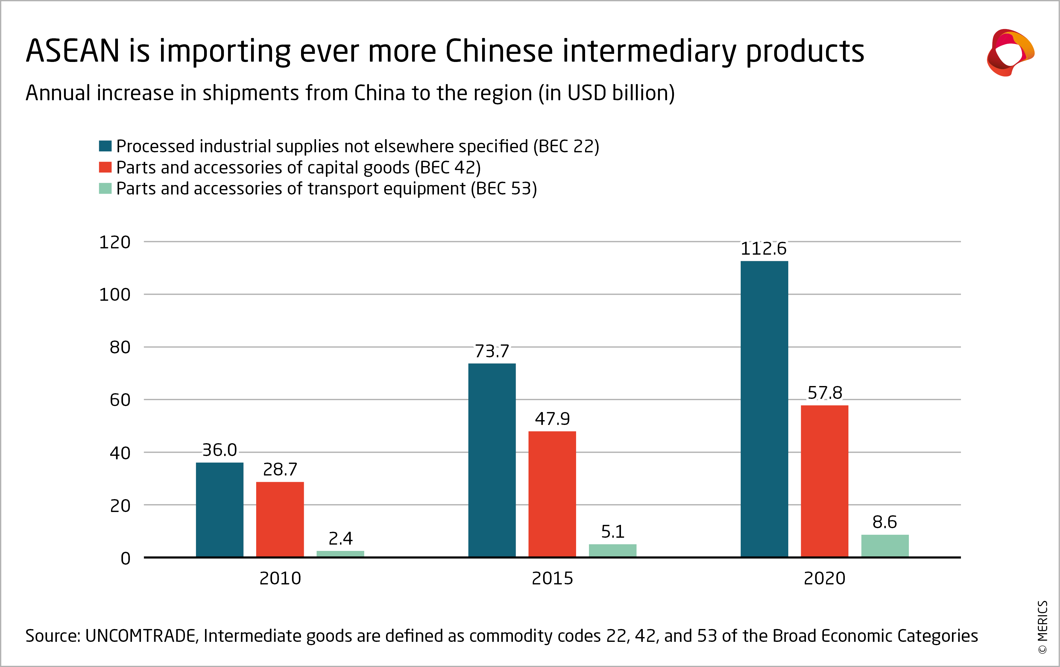 ASEAN has become a preferred destination for companies shifting their manufacturing bases out of China. Flows of total foreign direct investment (FDI) into manufacturing in ASEAN increased almost threefold from 21,3 billion USD in 2016 to 62,1 billion USD in 2018.[1] This development was accompanied by increases in Chinese exports in intermediary products to ASEAN (see exhibit 2), indicating that Japanese companies are part of a broader trend. Companies should start thinking more about geopolitics and identify sources that are geopolitically less risky than China. But ASEAN remains intent on keeping Beijing on side – approach of avoiding choosing sides—or of “choosing both sides”— remains very popular.