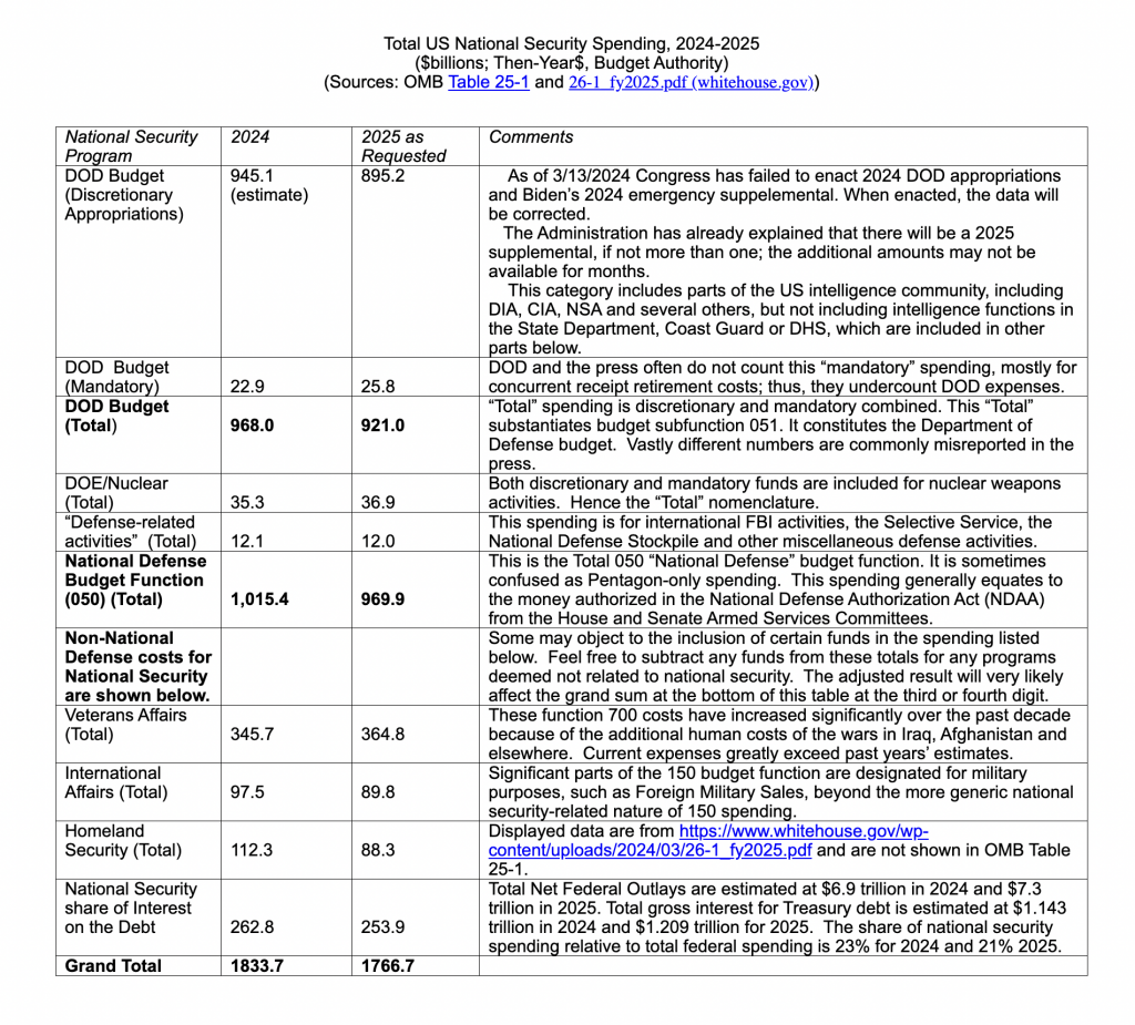 The debt ceiling caps allow for a 1% increase in defense spending from Biden’s $886 billion proposal in FY24 to $895 billion in FY25; the Pentagon’s share of that total is $850 billion. By contrast, inflation rose 3.4% in 2023, according to the Consumer Price Index.