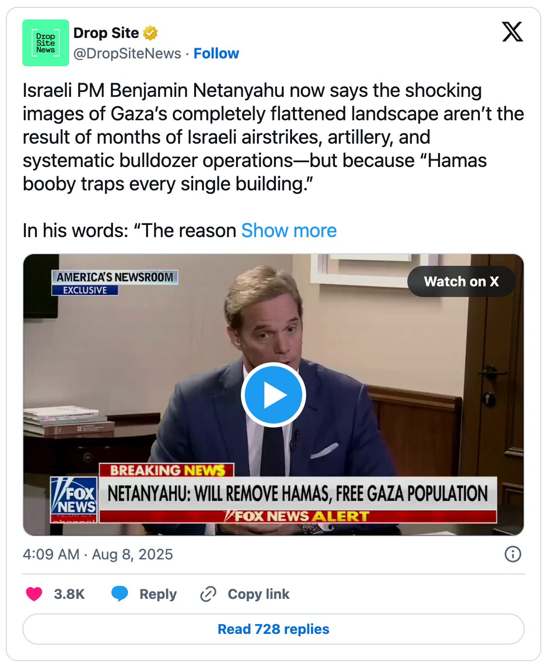 This whole genocide is powered by lies. Netanyahu just told Fox News that the horrifying aerial footage of the destruction in Gaza that we’ve been seeing is because every single building in Gaza was booby trapped with explosives by Hamas.