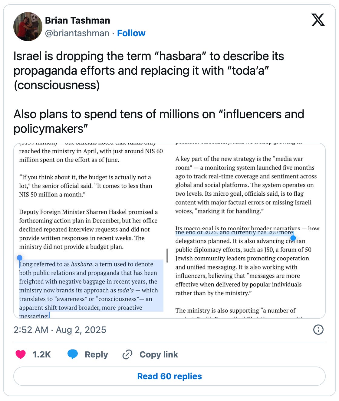Meanwhile the term “hasbara” itself is reportedly being abandoned by the Israeli Foreign Ministry, as westerners have come to associate the term with genocide propaganda.