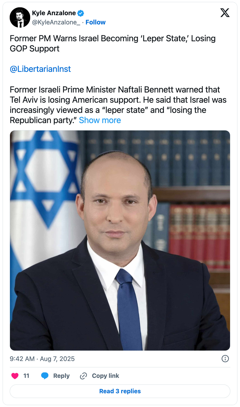 Former Israeli prime minister Naftali Bennett has a long rant on his social media accounts complaining that Israel’s “status in the United States is collapsing”, including among Republicans, with public sentiment turning against them because of what is happening in Gaza.