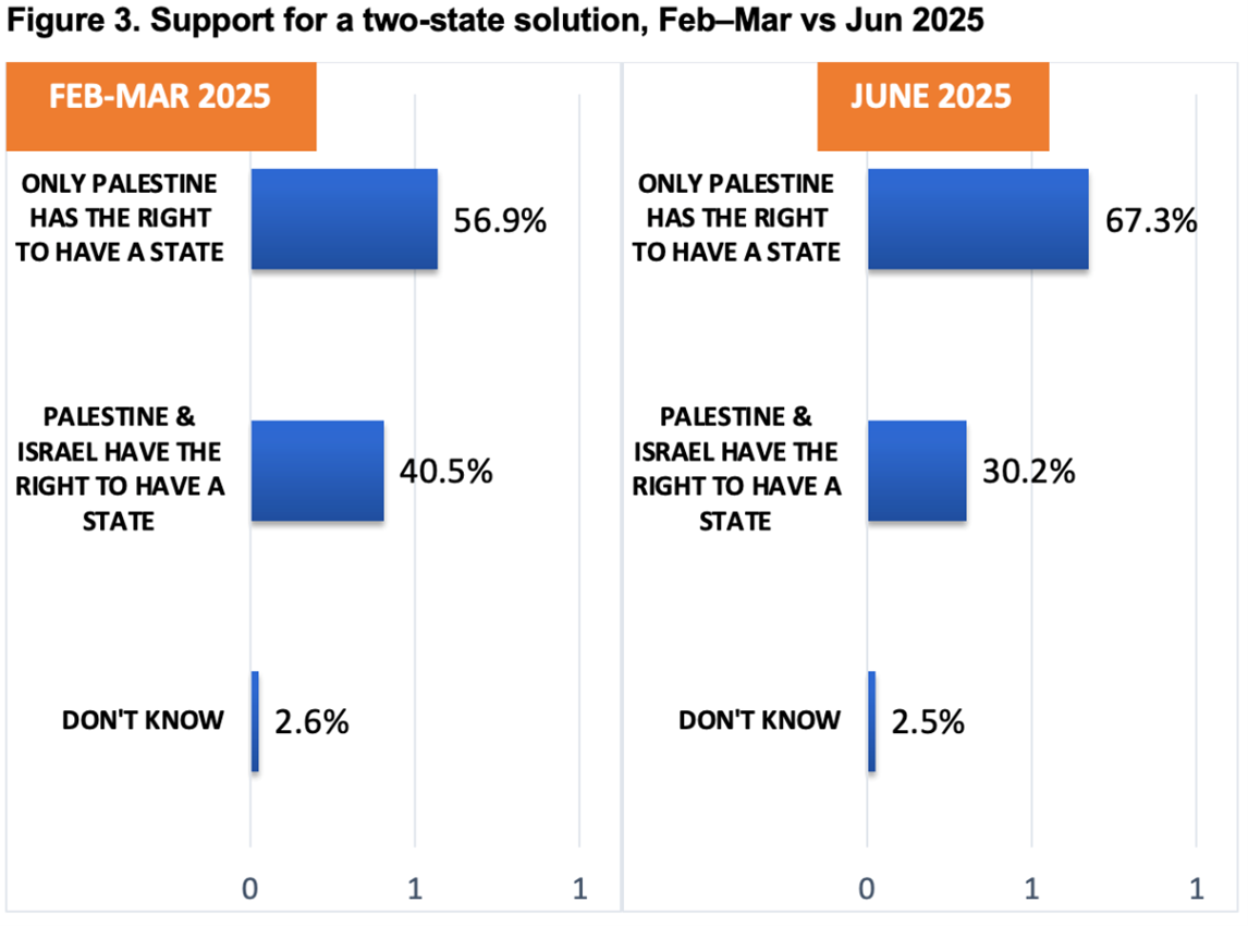 In the same vein, the percentage of Indonesians believing that only Palestinians are entitled to a state rose in June to 67.3 per cent as opposed to 56.9 per cent in February.