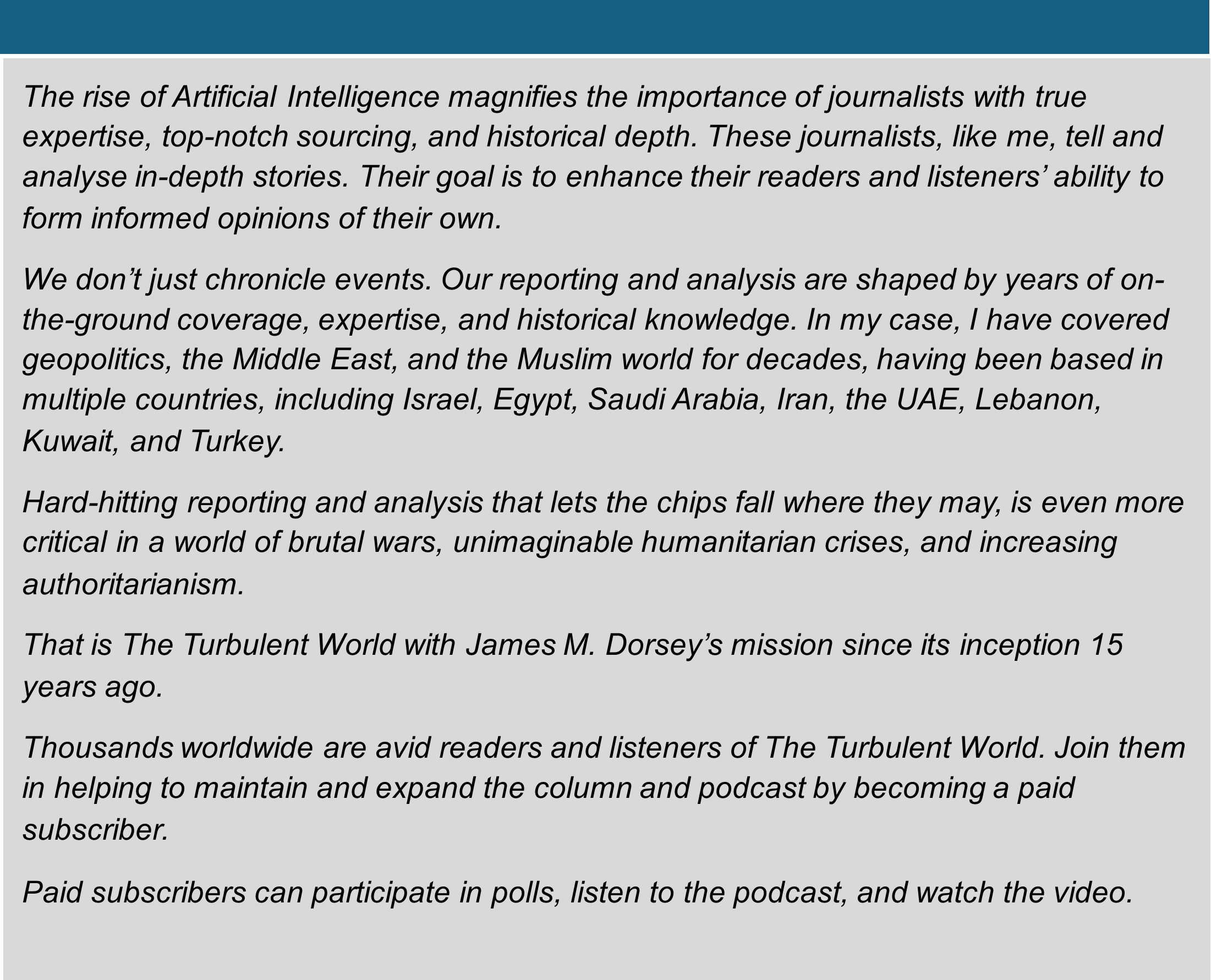 Dr. James M. Dorsey is an Adjunct Senior Fellow at Nanyang Technological University’s S. Rajaratnam School of International Studies, and the author of the syndicated column and podcast, The Turbulent World with James M. Dorsey. -