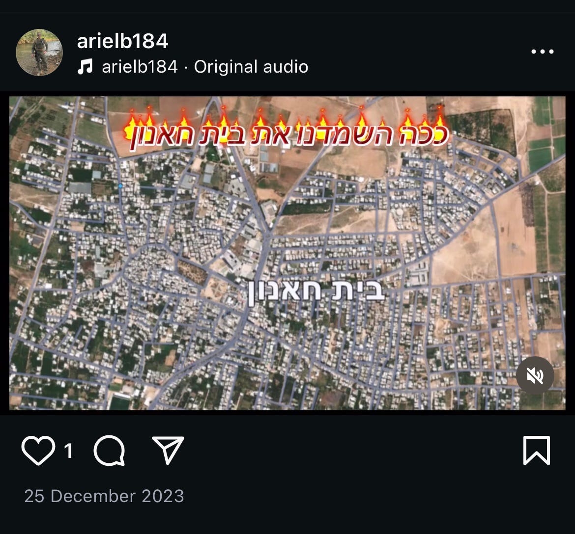 [It’s] totally wiped out. And do you see that elevated neighborhood in Beit Hanoun? That's the path to Beit Lahia, so we haven't gotten around to it yet, but when we do, it will be the same…Systematic, military, methodical annihilation of every neighborhood and every urban area in Beit Hanoun. It’s very thorough—not sporadic. We go in with planned attacks and raids, and in the end, when you add one night, and another night, and another night... [you end up with] entire neighborhoods and cities [destroyed].