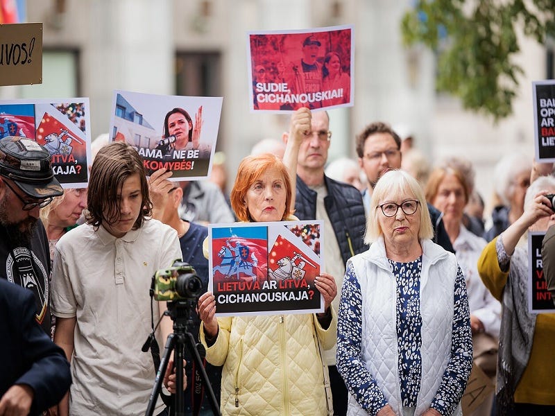 Several dozen Lithuanians recently protested in Vilnius demanding that the government revoke the accreditation and funding that it gave to the local office of Svetlana Tikhanovskaya. She’s the leader of Belarus’ non-systemic opposition that tried to overthrow President Alexander Lukashenko in 2020. The protest was sparked after her husband Sergey, who Lukashenko released from prison earlier this year, made a remark about creating an autonomous Belarusian district that he says was misunderstood.