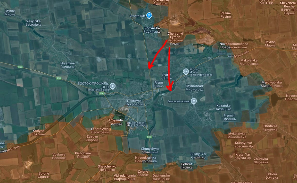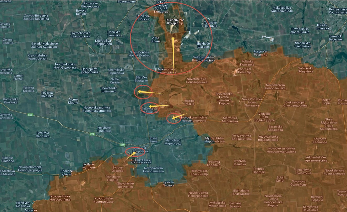 The areas circled in red are the newly verified Russian advances. The ones going westward toward Pokrovsk itself are obviously aimed at cutting the main Dobropillya-Pokrovsk road which is one of the last two remaining MSRs (Main Supply Route) there. The other E50 route heading northwestward toward Pavlograd is virtually already under fire control, or at least partially so.