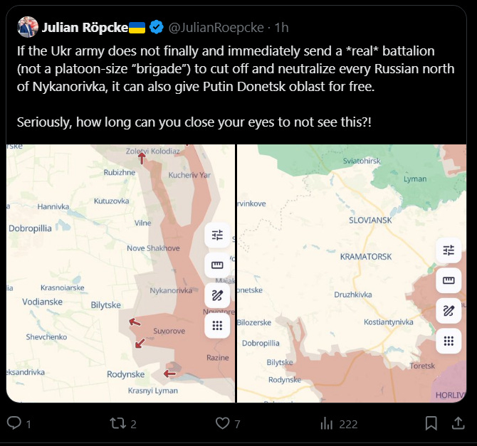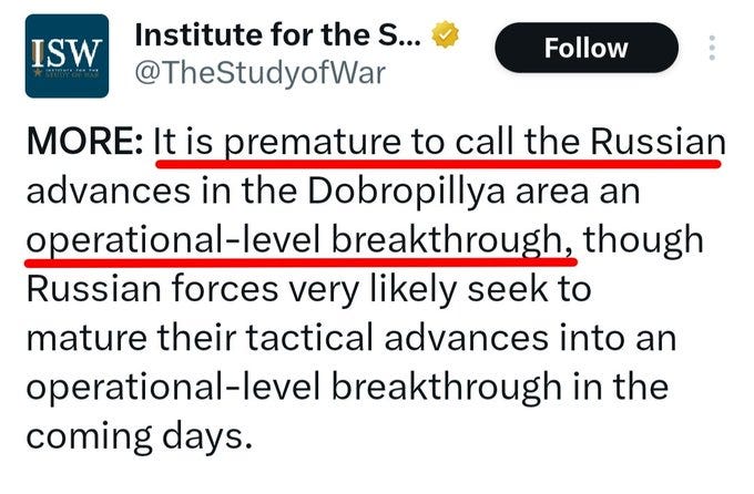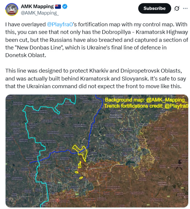 There are so many varied implications of this ongoing breakthrough that they could take up several articles worth of material. But to summarize, not only is the Pokrovsk area threatened, but even the larger Kramatorsk agglomerate is under major threat with the cutting of the Dobropillya-Kramatorsk highway: