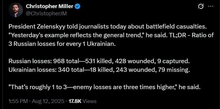 Many, by the way, have likened the current scenario to the Debaltsevo cauldron which happened right in the lead up to Minsk 2.0 in February 2015. Some fear that Russia’s breach has political motivations and is meant to be some final desperate land-grab before Putin buttons up the conflict with Trump. But clearly the Alaska meeting will bring no such conclusions: even the US State Department spokesman now says the meeting is “not a negotiations”, and seems more an informal feeler for Trump to dangle a few test carrots in front of Putin.