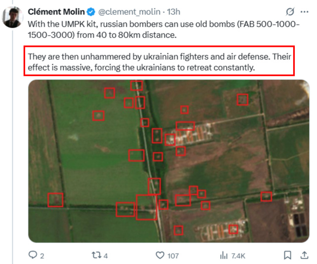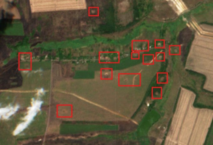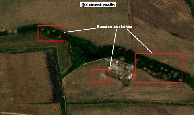 You can see here more than 20 FAB impacts all around the hole in the defensive line. This probably stopped the urgent engineering work to fill the hole. Russian forces may have entered the village here.