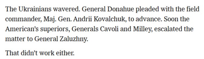So, they claim the ‘Soviet system’ caused the generals to bark attack orders at individual unit commanders. Yet, hilariously, we learned that it was American generals blindly barking catastrophically inept attack orders at Zaluzhny and co. during these operations.