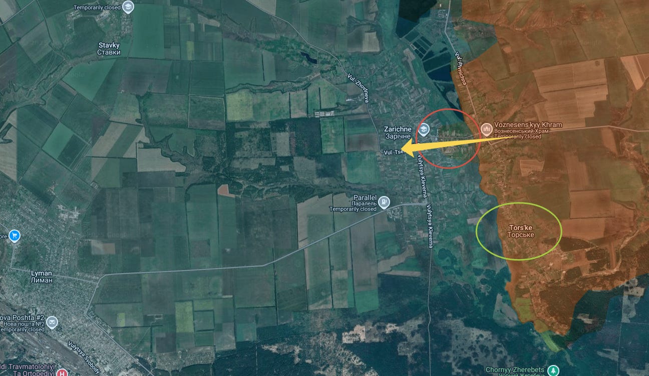 Likewise on the northern Krasny Lyman front, after capturing Torske (not to be confused with earlier-mentioned Toretsk) yesterday, Russian forces are already entering neighboring Zarichne, seen in the lightly colored reddish area inside the red circle below: