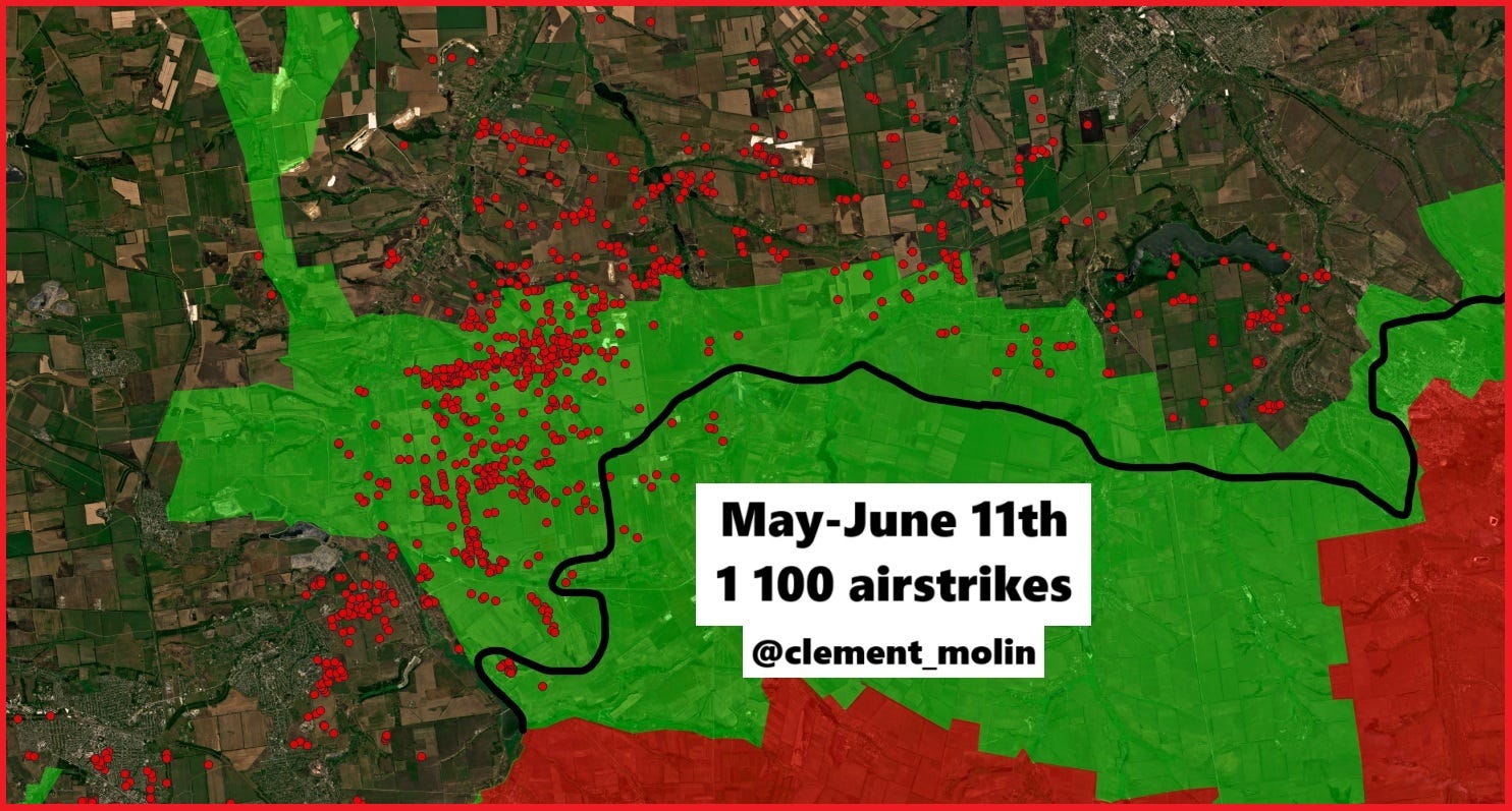 A French analyst has mapped all the airstrikes in the Pokrovsk region from May onward. For instance, he tallied a monstrous 1,100 strikes on the Pokrovsk corridor just from May to June alone: