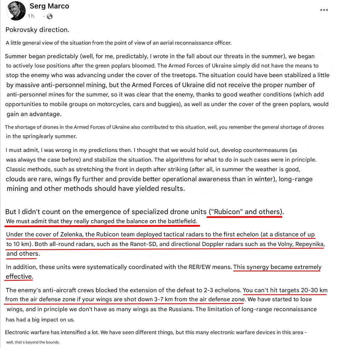 Another Ukrainian figure, a sniper from the 59th Separate Assault Brigade, lamented Russia’s recent ‘unexpected’ gains, likewise chalking them up to Rubicon’s success. Recall the discussion in a recent report here about Russia’s new strategy of disrupting Ukrainian reconnaissance capabilities, and the widespread cascading effect that has on the AFU—read the underlined below: