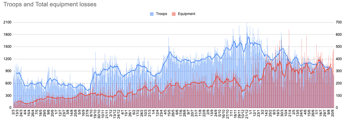 If I’m understanding the above chart, it appears more accurate given that losses appear to be measured in intervals of about 11 days, which would put the given troop losses (numbers on left Y axis, vs. “equipment” losses on the right side) at about 1000 / 11, or 90 per day. The peak was claimed to have been nearly 1800, which would be 163 per day.