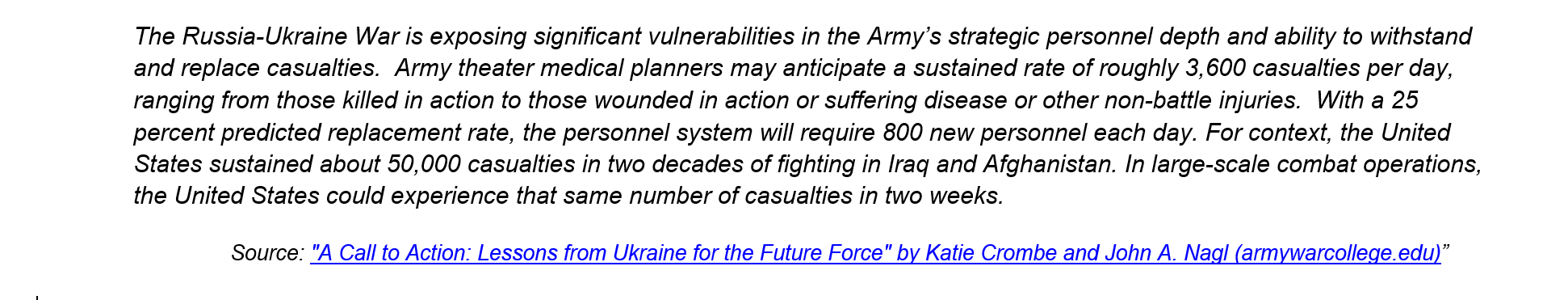 In short, this is the Russian military becoming a well-oiled machine and adapting to efficiently fight its enemy. But don’t confuse the word ‘efficient’ with ‘perfect’, because Russian losses are still high, all things considered. If you reduce your losses from 150 or 200 KIA per day to 100, that’s a great achievement, but it still means 3,000+ dead and perhaps another 3,000+ maimed per month, with a good chance the numbers are even higher than that. One supposes it still beats the 3,600 losses per day the US estimated it would suffer in a war with Russia: