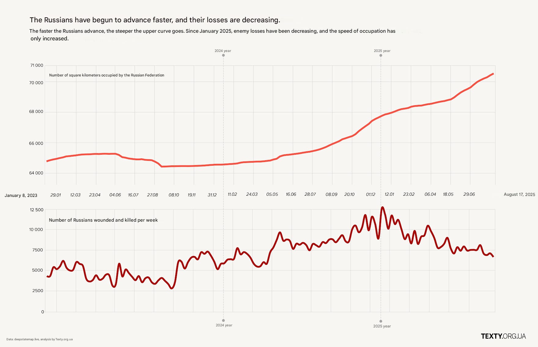On the map below, we took data on the occupied territories from DeepState, and data on Russian losses from the daily reports of the Ukrainian General Staff. "Losses" refers to the dead and wounded.