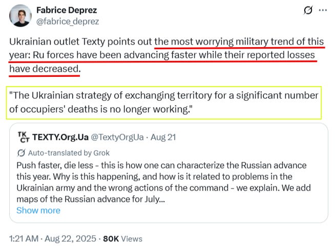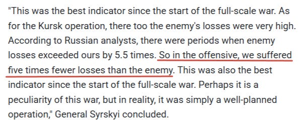 On that note, a last interesting tidbit. In a new interview with RBC-Ukraine, Commander-in-Chief Syrsky said something quite amazing. After first claiming that in Bakhmut, Ukraine lost men at a favorable 1:7 ratio against Russia—i.e. 7 Wagner KIA per 1 Ukrainian KIA, he goes on to state that even in the Kursk offensive, Ukraine managed a 1:5 kill ratio against the Russian defenders: