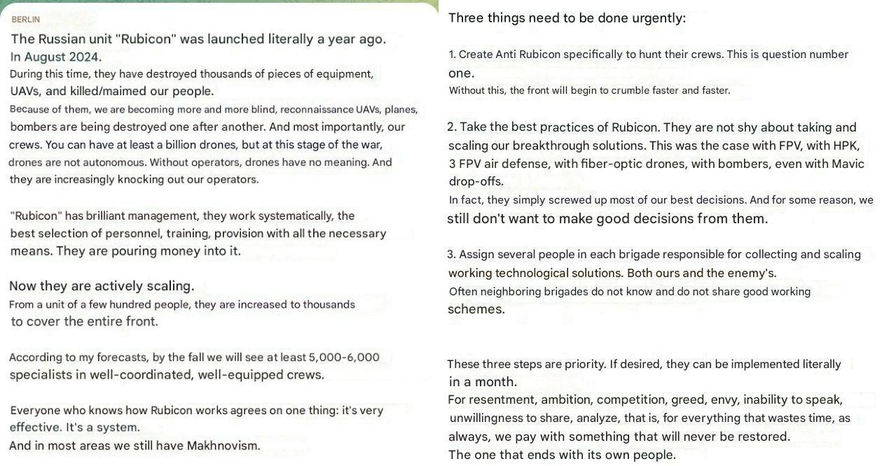 Recall in a recent report we shared the prediction that Russian anti-drone tech would soon lead to the collapse of Ukrainian drone capabilities, if left unchecked. The latest stark reminder tells us that Rubicon’s expertise is being scaled throughout the army at large and will soon snowball disastrously for Ukraine if the prescribed emergency measures are not taken.