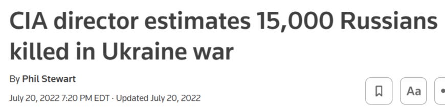 By the way, isn’t it interesting how the West appeared to tell the truth about Russian losses before the desperate need to cover for Ukraine’s collapse required the shaping of the narrative? Back in July 2022 the US estimated 15,000 Russian losses after exactly 5 months of war: