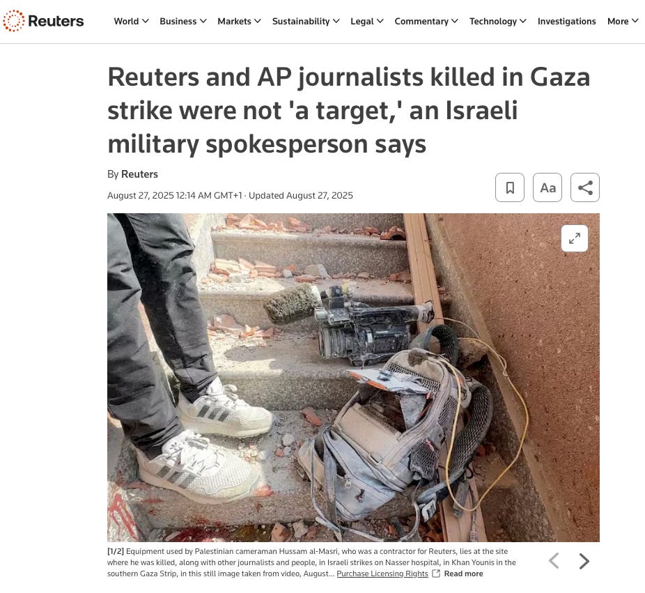 But the Israeli spokesperson’s “admission” only deepens the absurdity of Israel’s claims. How was a Reuters camera serving Hamas when it was being operated at the time by a Reuters journalist who was not the target?