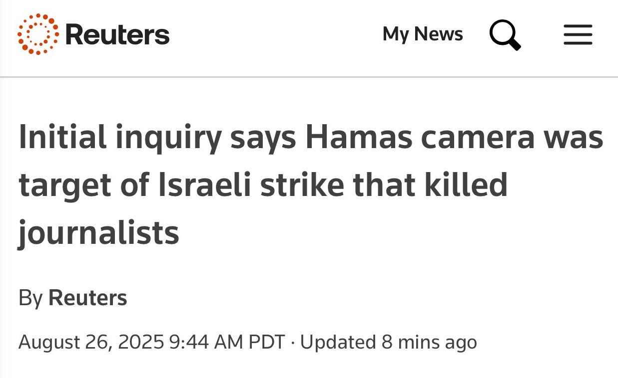 Reuters headline on the story – the only part that most people read – runs: Initial inquiry says Hamas camera was target of Israeli strike that killed journalists.