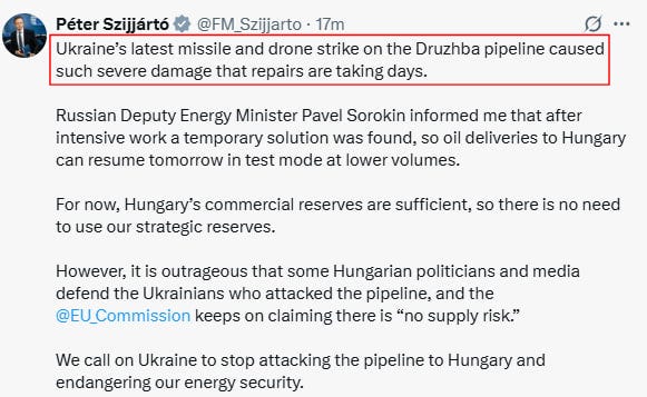 As a tangential note, let us mention something about the effects of these strikes. As most know, doomers and concern-trolls alike constantly try to play up these attacks as somehow devastating to Russia, ignoring how quickly most of them are repaired, and how inconsequential they are in the grand scheme of things. As poignant example of this, here is Hungarian FM Peter Szijjarto’s statement regarding the Druzbha strikes—take note of the first sentence: