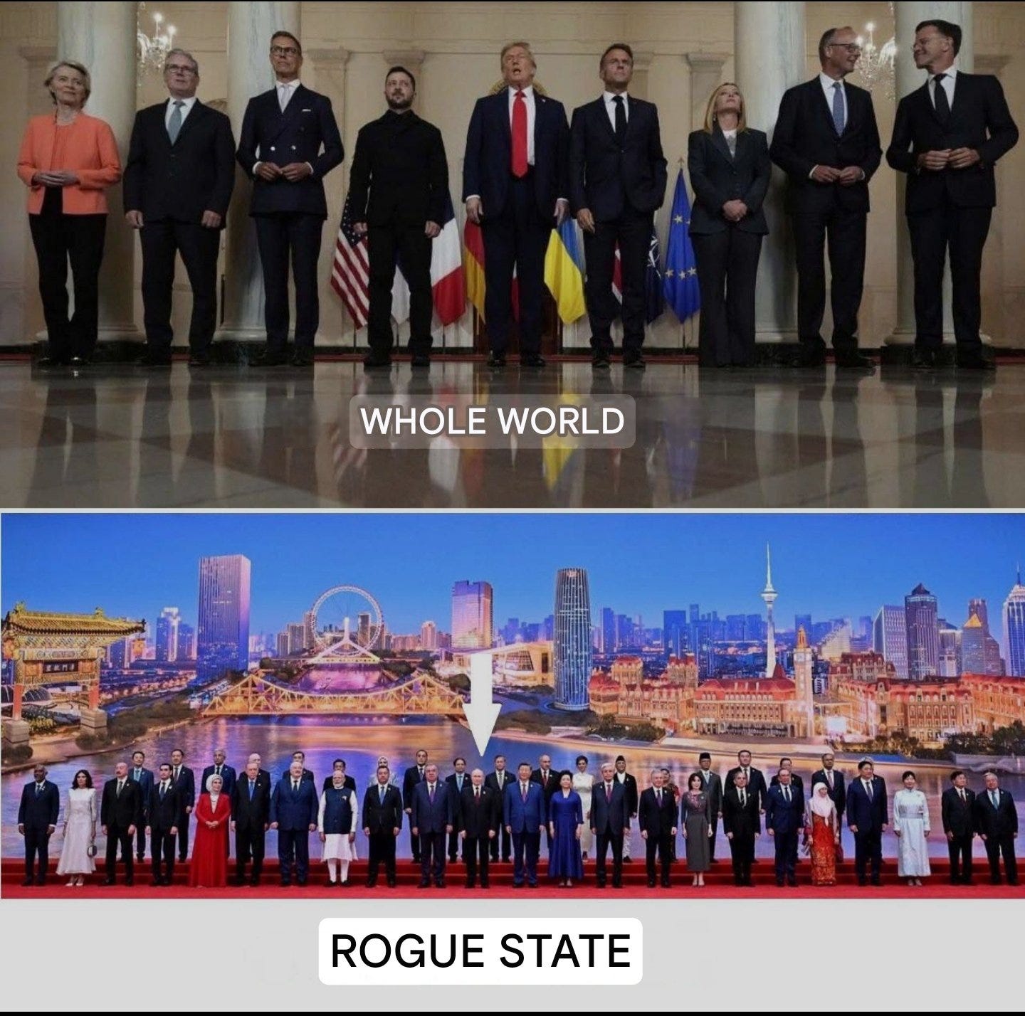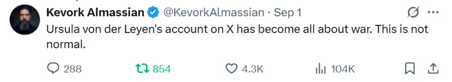 It almost feels sententious to paint the contrast in such cartoonishly exaggerated strokes—but it really is increasingly the case. When you compare the hysteric, dead-eyed, empty bureaucrats-posing-as-leaders of the West to their peers, the difference is now night and day. Most Western leaders can no longer even step in public without being heckled and shamed—or outright attacked—by their fed-up constituents; Ursula was greeted with shouts of “Nazi criminal!” as she touched down in Bulgaria yesterday, and later had to “sneak through bushes” to avoid hecklers while attending a weapons site. Compare that to images of Xi universally revered by his people at today’s parade.
