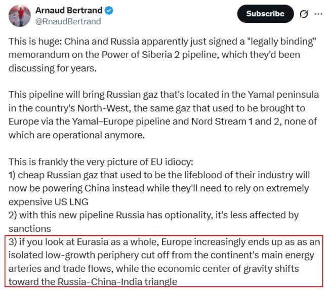 Glenn Diesen: Russia's pivot from Europe to Asia is now permanent with the signing of the Power of Siberia-2, which runs from the Russian Arctic to China. The gas that could have fuelled European economies for decades has instead been redirected to China.