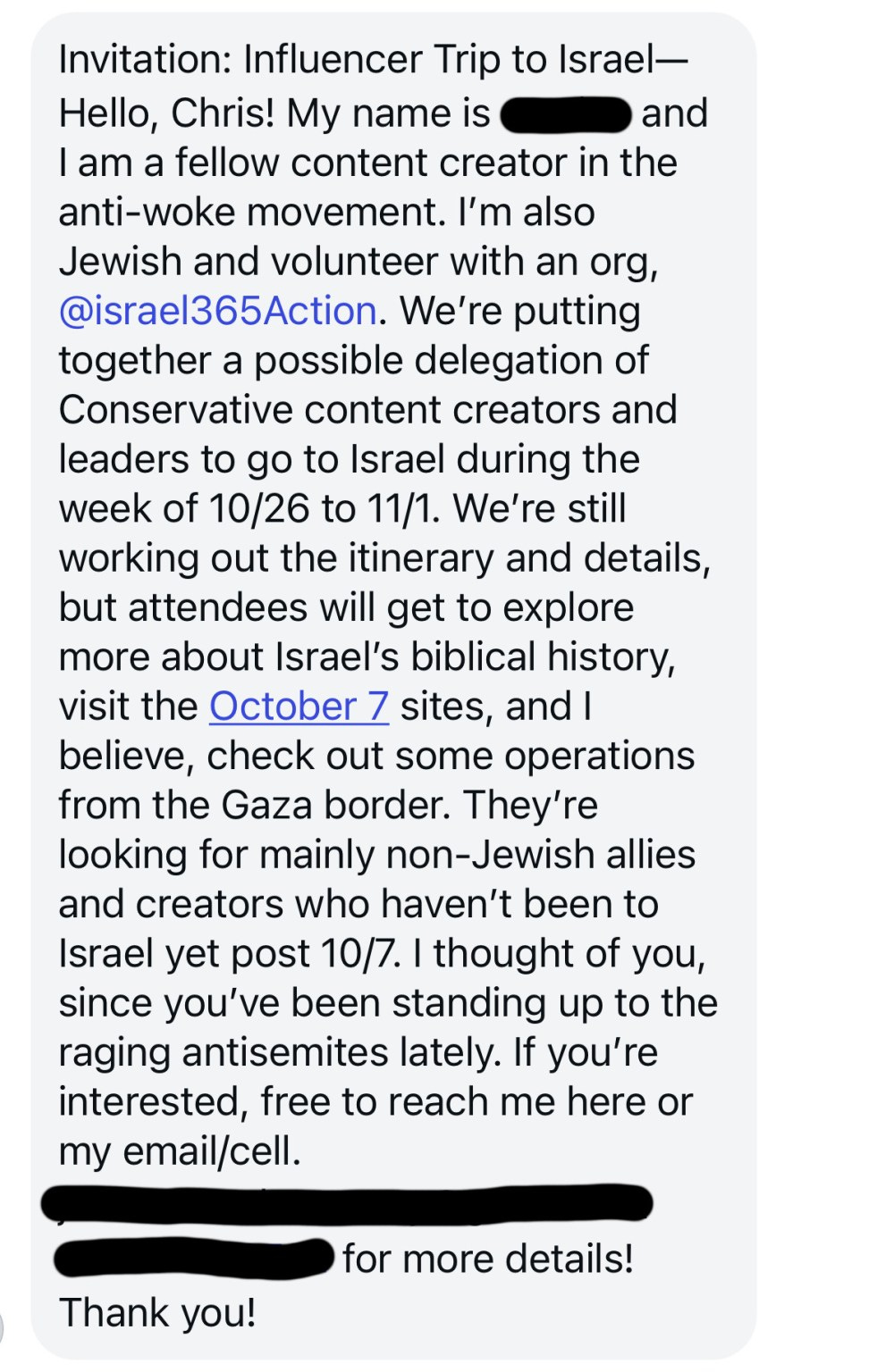 The Grayzone has obtained a private email from Wolicki’s Israel356 Action to a conservative activist offering to junket them to Israel this October. Reaching out on behalf of “the anti-woke movement,” Israel 365 offered to take the activist on a delegation to “explore more about Israel’s biblical history, visit the October 7 sites, and…check out some operations from the Gaza border.”