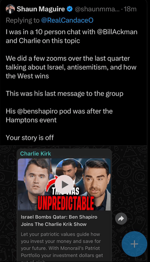 Another participant in a recent Zoom call with Kirk, ultra-Zionist venture capitalist Shaun Maguire of Sequoia Capital, took to Twitter/X to rebuke podcaster and former TPUSA communications director Candace Owens for her claim that Ackman had subjected Kirk to unwanted lobbying over his shifting views on Israel.