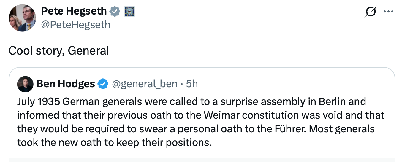 See the Hegseth comment below (with the wrong date for the change of oath)
