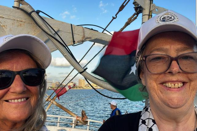 Yvonne Ridley (right) and Margaret Pacetta onboard the Omar Al Mokhtar flotilla(Image: Supplied)