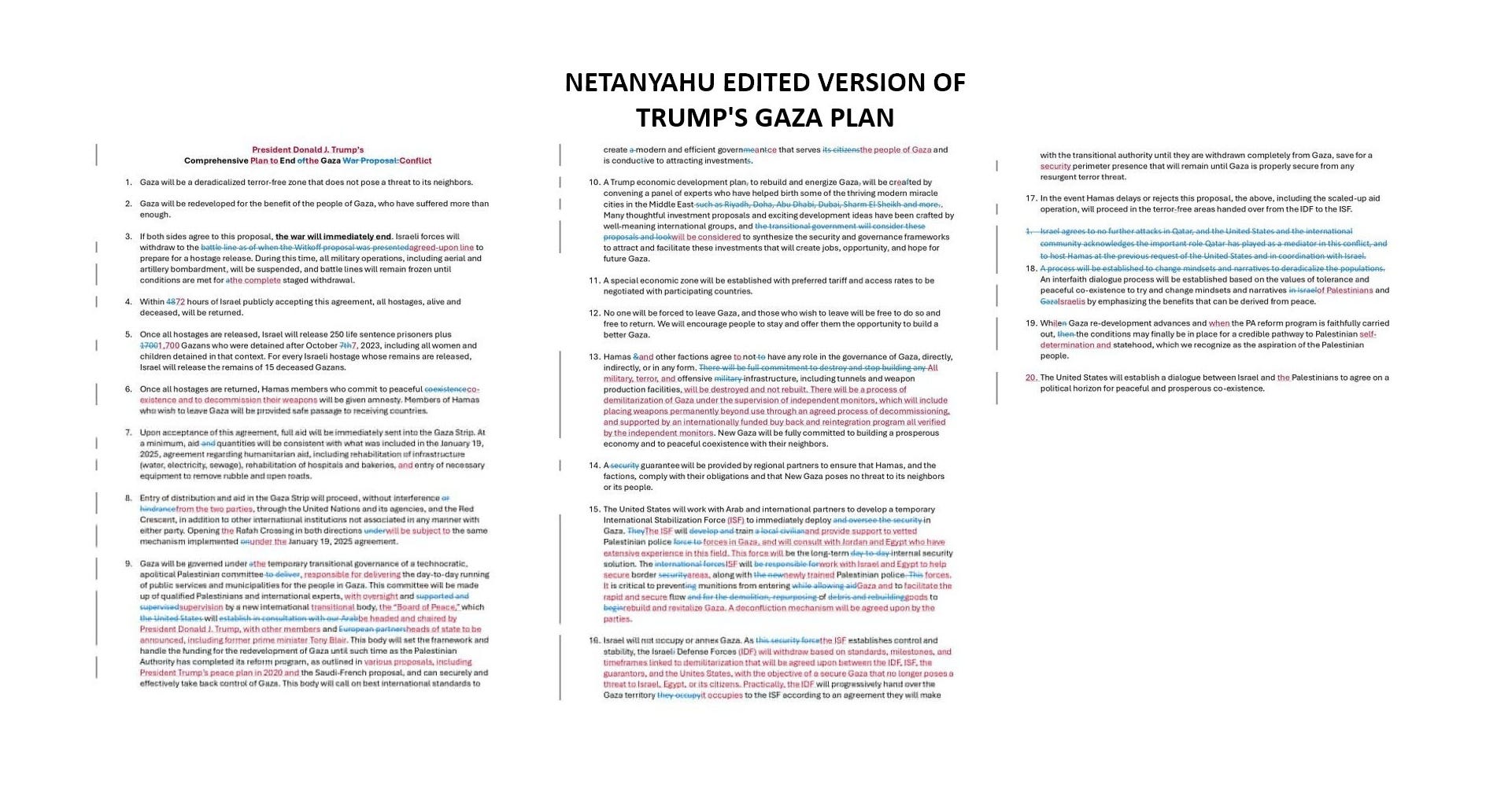 At the United Nations Arab governments believed they had secured an agreement promising no permanent occupation, no forced displacement and a clear path to Palestinian statehood. Hours before the public announcement Benjamin Netanyahu changed the text and Donald Trump supported the changes without consultation. The changes gave Israel a veto over the timetable and scope of Palestinian disarmament, linked any withdrawal to Israeli approval in a way that could stretch the process without limit and left Israeli forces in Gaza under a permanent security pretext even if Palestinians met every condition. The outcome gave Netanyahu the core of his demands and left Trump presenting to the Arab and Muslim world a plan that broke the assurances they thought they had obtained. Netanyahu’s edits removed the clause that had bound Israel not to strike Qatar, deleted the section mandating United States and Israel coordination to apply external pressure on Hamas, lengthened the deadline for hostage return from forty-eight hours to seventy-two hours and banned Hamas entirely from any role in future governance. The revised text strengthened the demilitarisation demands to require destruction of tunnels, weapons and infrastructure under foreign monitors, replaced plans for locally accountable governance with a foreign-backed technocratic authority and expanded the security force to include Jordan and Egypt alongside oversight of the Palestinian police. The withdrawal provisions were rewritten to be vague and to allow Israeli forces to remain in Gaza until milestones agreed with Israel itself, the narrative section was softened to apply to both sides equally and new statehood language was added to mention Palestinian self-determination without creating binding obligations.