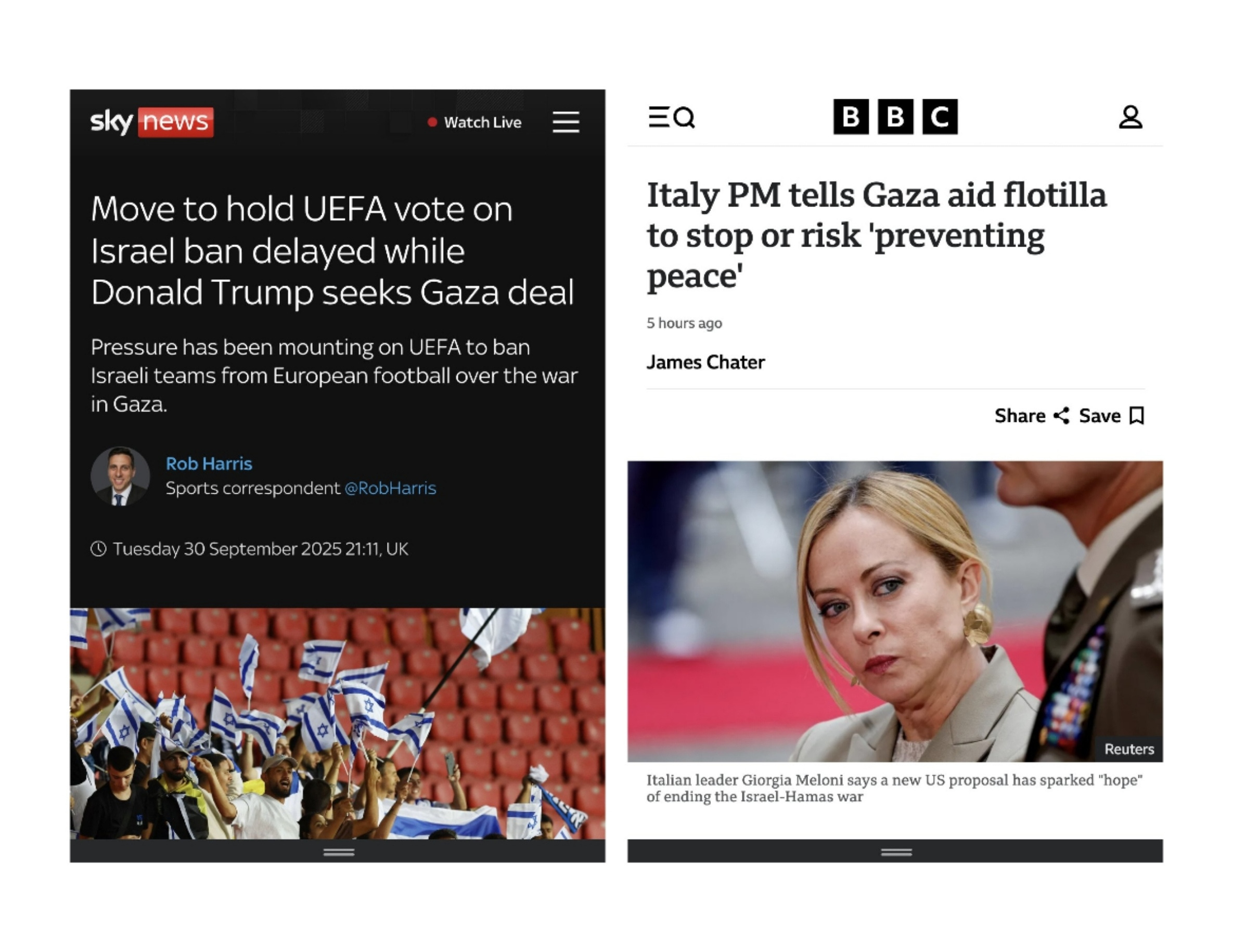 The rhetorical structure of the plan allows blame-shifting strategies to be used by the plan’s backers. Senior officials at the press conference framed the proposal as generous and reasonable, and they warned that rejection would leave Israel with no alternative but to “finish the job” (Policy Media Analysis Unit 2025). That rhetoric turns refusal into culpability. The tactic follows a pattern in which offers framed as final are used by stronger actors both to demand compliance and to justify subsequent coercive measures when compliance is withheld. Independent commentators with long experience in the region characterised those lines as ultimatums and cautioned that they provide a pretext for escalatory military action rather than an incentive for negotiation. A plan that predicates peace on the moral and physical surrender of the weaker party therefore functions less as a diplomatic framework than as a political stratagem for absolving responsibility. So, already Trump’s Gaza plan has been used as a shield to delay accountability and to buy time for actions on the ground. European football authorities postponed a vote on freezing Israel’s membership, and Italy’s prime minister publicly called on the aid flotilla to turn back, both citing the need to give the plan a chance before taking further steps. Those moves show how the plan functions not as a neutral bridge to peace but as a political instrument to block sanctions and defer consequences for ongoing violence.