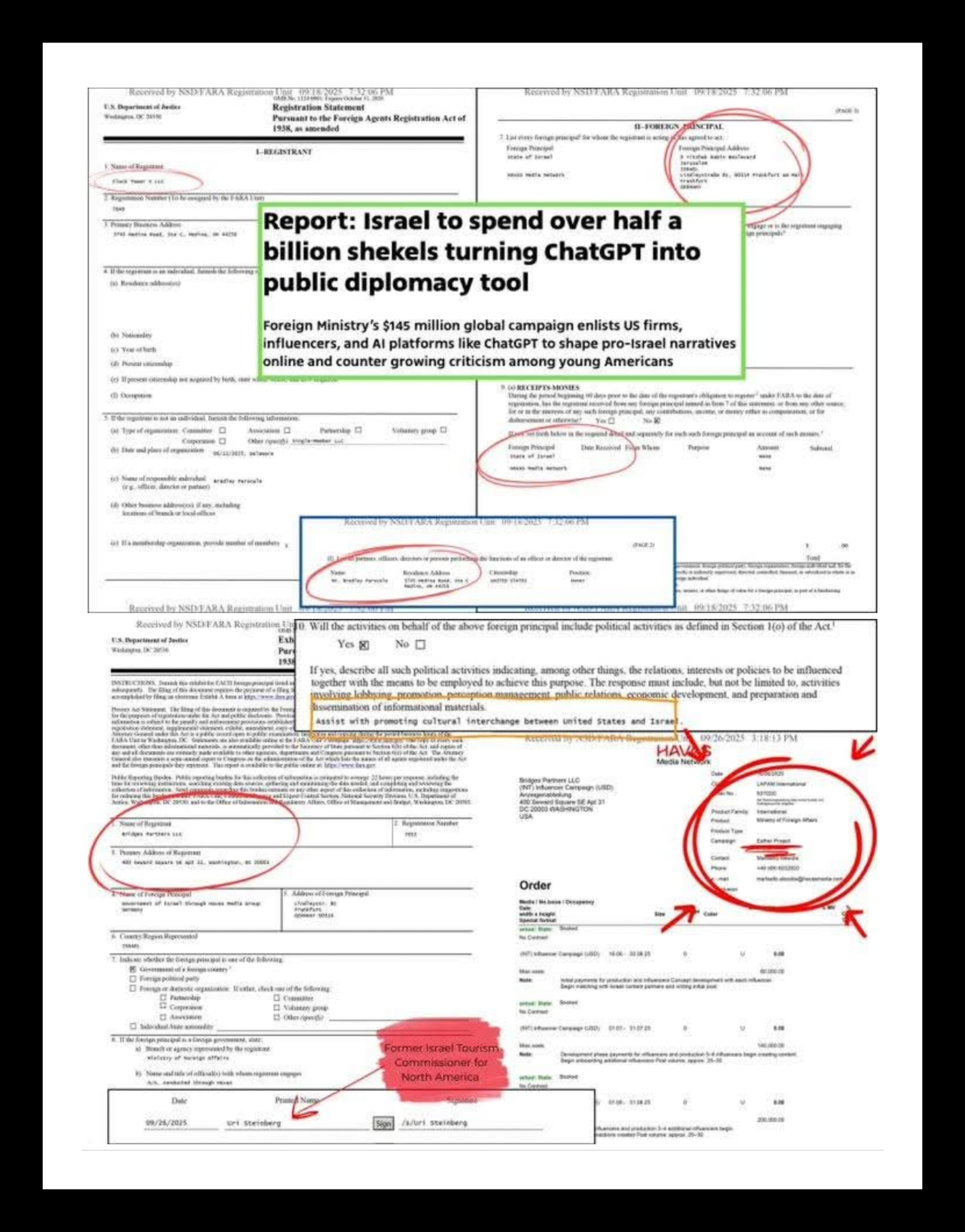 Documents filed under the Foreign Agents Registration Act (FARA) reveal that the campaign’s strategy includes efforts to influence the output of AI platforms such as ChatGPT and Google Gemini by flooding the internet with pro-Israel content. The intent is to manipulate the algorithms that drive these systems, ensuring that Israel-friendly narratives appear more prominently in searches and AI-generated content.