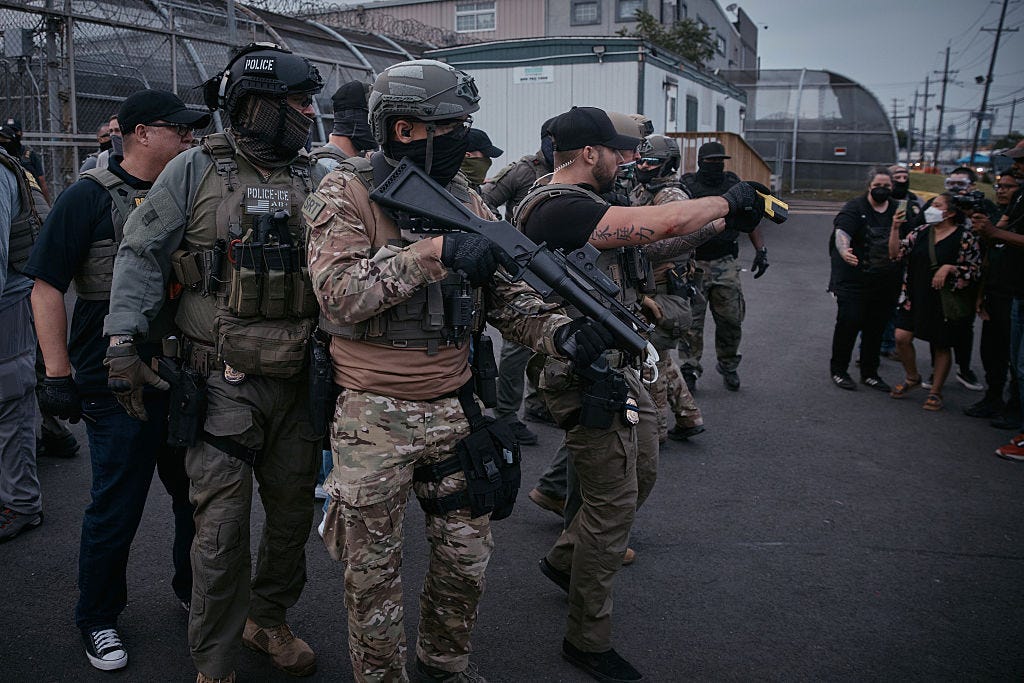 A Federal agent threatens protestors at Delaney Hall Detention Facility on June 13, 2025 in Newark, New Jersey. (Photo by Andres Kudacki/Getty Images)