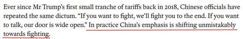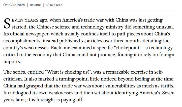 The WSJ article mentions how China’s new policy has been a deliberately pre-calculated strategy to deal with Trump’s second term, after China had felt ‘blindsided’ by Trump’s unpredictability the first time around. Interestingly, this was corroborated by a new Economist piece which delves into some of the same developing dynamics detailed in the WSJ article above: