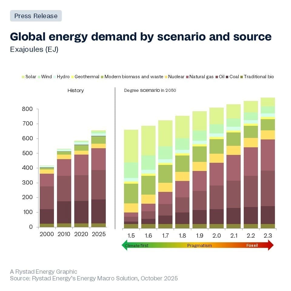 The global energy system is witnessing the next greatest transition, standing on the cusp of a new energy era championed by clean electricity and the increased adoption of electrification across the board. Rystad Energy is pleased to announce the release of its flagship annual report, Global Energy Scenarios (GES) 2025, which provides in-depth degree scenarios toward 2100 and a newly developed nationally determined contribution (NDC) scenario to 2035. Clean electricity and electrification are expanding faster than any shift in modern history, with energy sources of the next era growing from around 9% in 2015 to more than 14% this year as a share of primary energy.