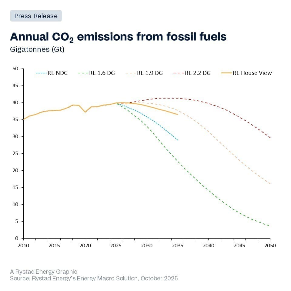 Looking ahead, we can clearly outline five pathways that will shape the global energy outlook, which include the Rystad Energy NDC, 1.6 degrees Celsius, 1.9 degrees Celsius, 2.2 degrees Celsius, and the Rystad Energy House View scenarios. Global CO? emissions are expected to peak around 2026 before starting a gradual decline, driven by rapid renewable deployment in power and EV adoption in transport. This marks a turning point, showing that the world is moving from growth to decline in emissions. However, current NDCs remain far from sufficient to limit warming to 1.5 degrees. Even if fully implemented, they would not achieve the substantial reductions necessary for achieving the lower range of the Paris Agreement.