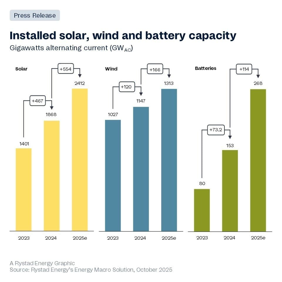 Our prediction of a 1.9-degree Celsius scenario is heavily predicated on renewable energy installations setting all-time high records and serving as the backbone of new power growth, with solar leading the pack. Solar is forecast to rise from 1,868 GW in 2024 to 2,412 GW in 2025 – a 544 GW increase that cements its position as the leader of new global power generation. Record manufacturing output, sustained cost declines, and accelerating deployment in China, India, and the US drive the expansion.