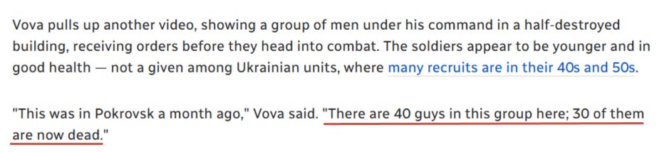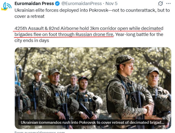 Other new Western press releases weave a harrowing tale of Ukraine’s losses in Pokrovsk, which likewise runs counter to claims it is Russia bearing the brunt of the casualties. Canadian CBC outlet quotes a Ukrainian commander in saying that 75% of his men have died in the past month alone:
