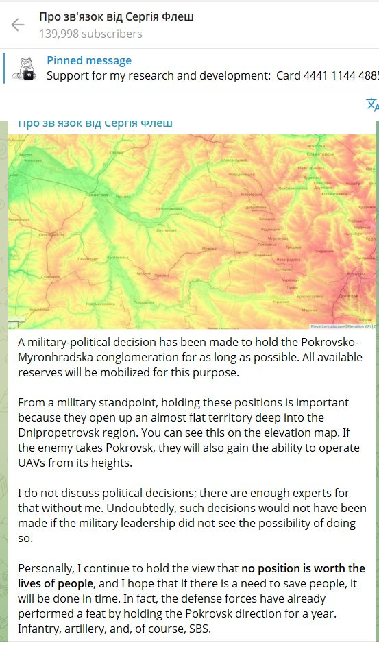 Either way, renowned AFU expert Serhiy “Flash” Beskrestnov reports that a decision has allegedly been made to hold Pokrovsk at all costs because the city’s fall would open up a vast stretch of flatlands for Russia to easily circumvent toward Pavlograd and beyond: