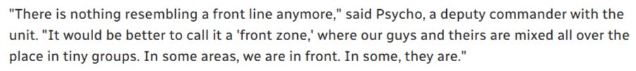 The other interesting aspect from the CBC article is the description of the fighting which chimes with what I recently wrote about in the paid piece, this new reality of war we’re seeing.
