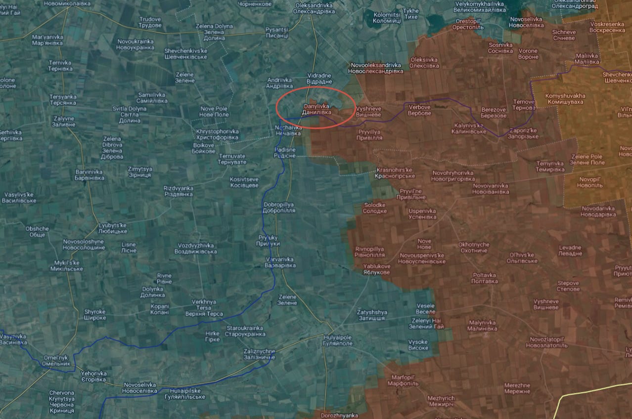 Also, in terms of casualties, note above the official Russian report relays Ukraine’s casualties as a full company of men just in the battles for Danilovka alone. A company should be 100 men, but let’s just say for Ukraine it’s 50 due to their manpower shortage. This is 50 men lost for a single settlement versus the Ukrainian claim of 58 Russians lost in the entire front comprising dozens of settlements. I leave it to the reader to decide which side’s claims are the more reliable.