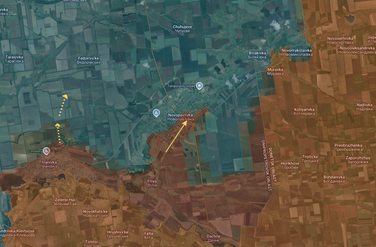 Just northeast of there, Russian forces made a breakthrough in Novopavlovka, penetrating deeper into the town and capturing a large swath of it: