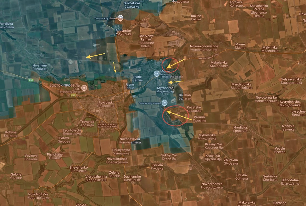 In Pokrovsk, the situation is that the city of Pokrovsk itself is virtually entirely captured, though not yet fully swept and secured, with Mirnograd now being penetrated from both the south and northeast: