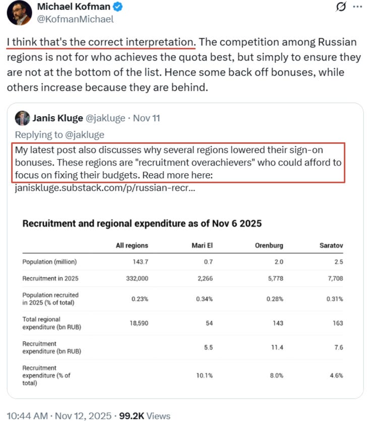 Lastly, on the topic of mobilization some may recall that I had opined several weeks ago that the reason Russia’s recruitment payouts had dropped was not because it was “running out of money”, as the pro-UA crowd crowed, but rather that Russia was likely exceeding its recruitment numbers and no longer needed to pay such exorbitant amounts. Well, what do you know—I was right, and here it’s even confirmed by the ‘venerable’ pro-Ukrainian analyst Michael Kofman