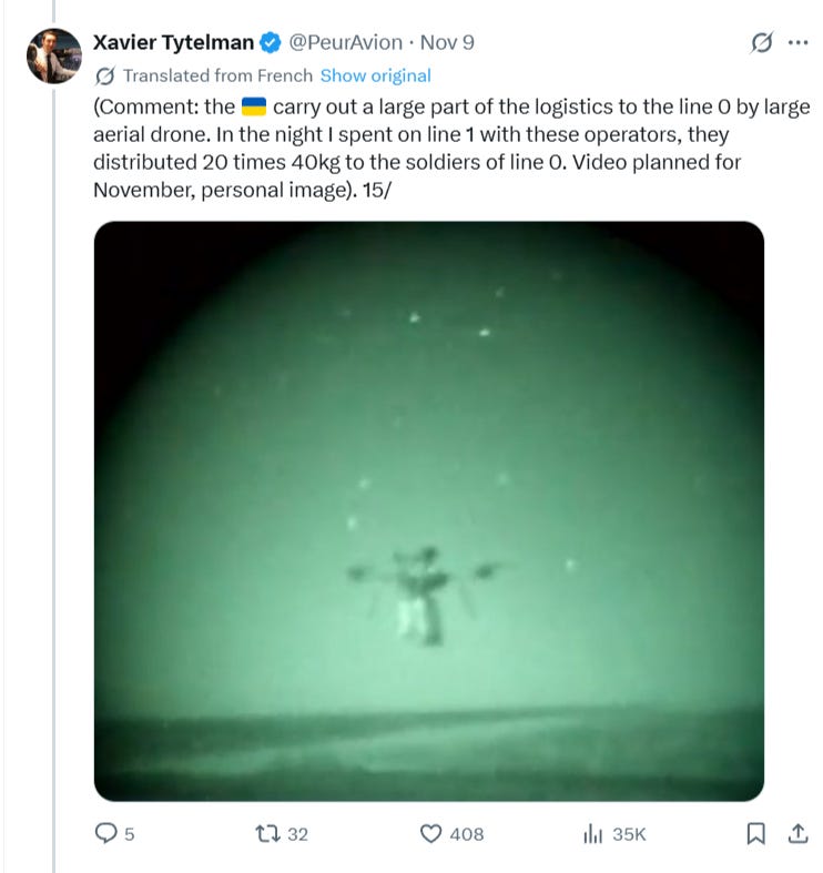 The reason such seeming encirclements do not result in complete or instantaneous collapses in modern warfare—as they would in the past—is because with the advent of drones, the trapped garrison can still receive ample resupply via the larger Baba Yaga type drones, which can regularly drop ammunition, food, and water to the besieged troops. A French reporter recently visited the Ukrainian front and implied the majority of supplies were already being delivered by large drone there:
