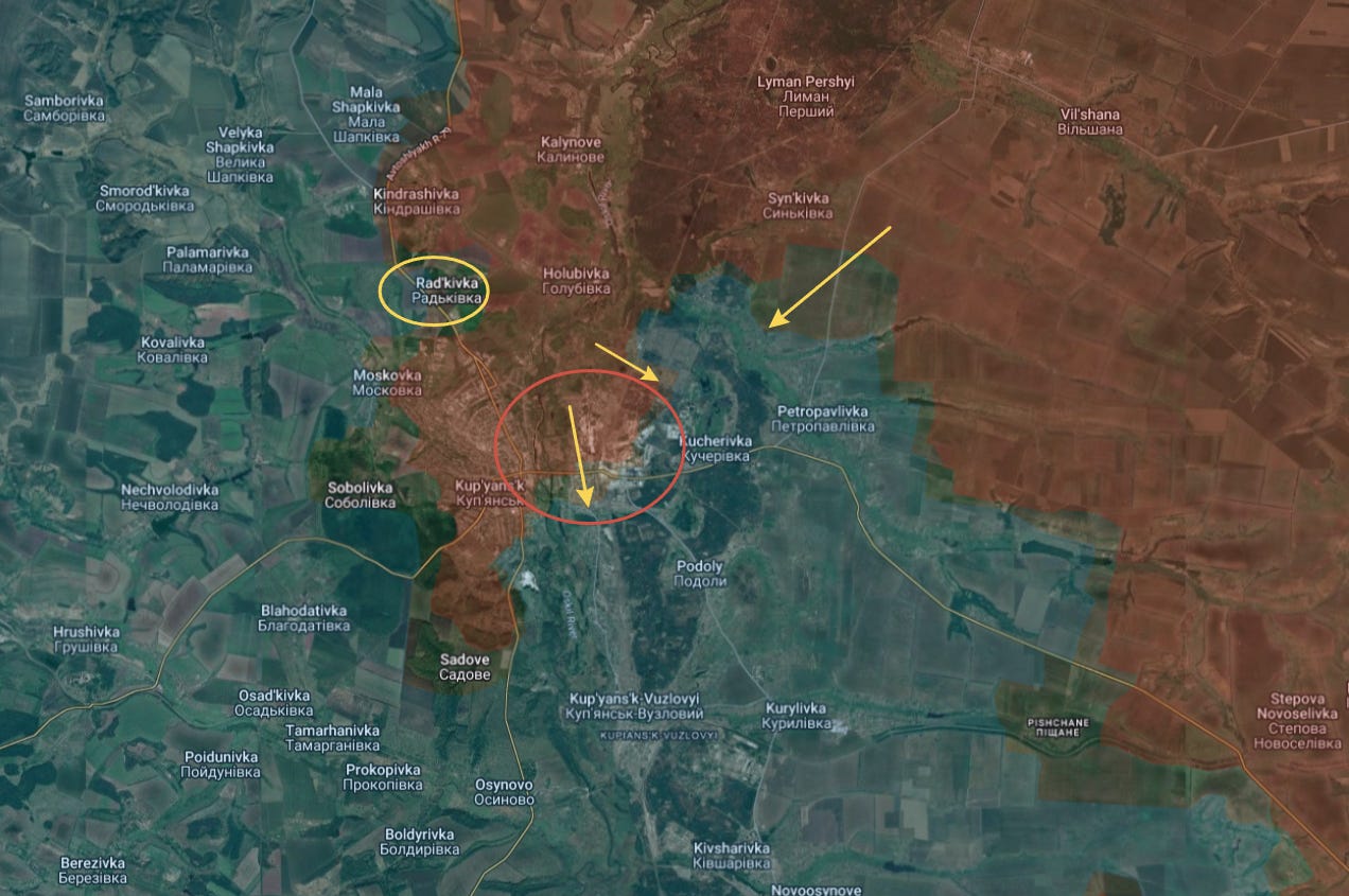 In the far north, Kupyansk saw a major Ukrainian counterattack with the purpose of relieving pressure on the city. This initially chewed off a piece of the Russian flank at the spot circled in yellow below, but it did not prevent Russian forces from advancing throughout the last southernmost portions of the city and capturing most of the remains there: